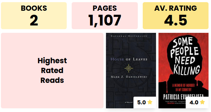 I felt like this book was intentionally trying to make me go crazy in the best way possible. I enjoyed the overall experience of reading this book even though it was also difficult. The text is dense, Johnny Truant’s sections are a mix of insanity, perversion, and tragedy, and you don’t know what’s true. Also I translated one of the Waterstone letters without looking it up and no book has made me feel that disturbed.