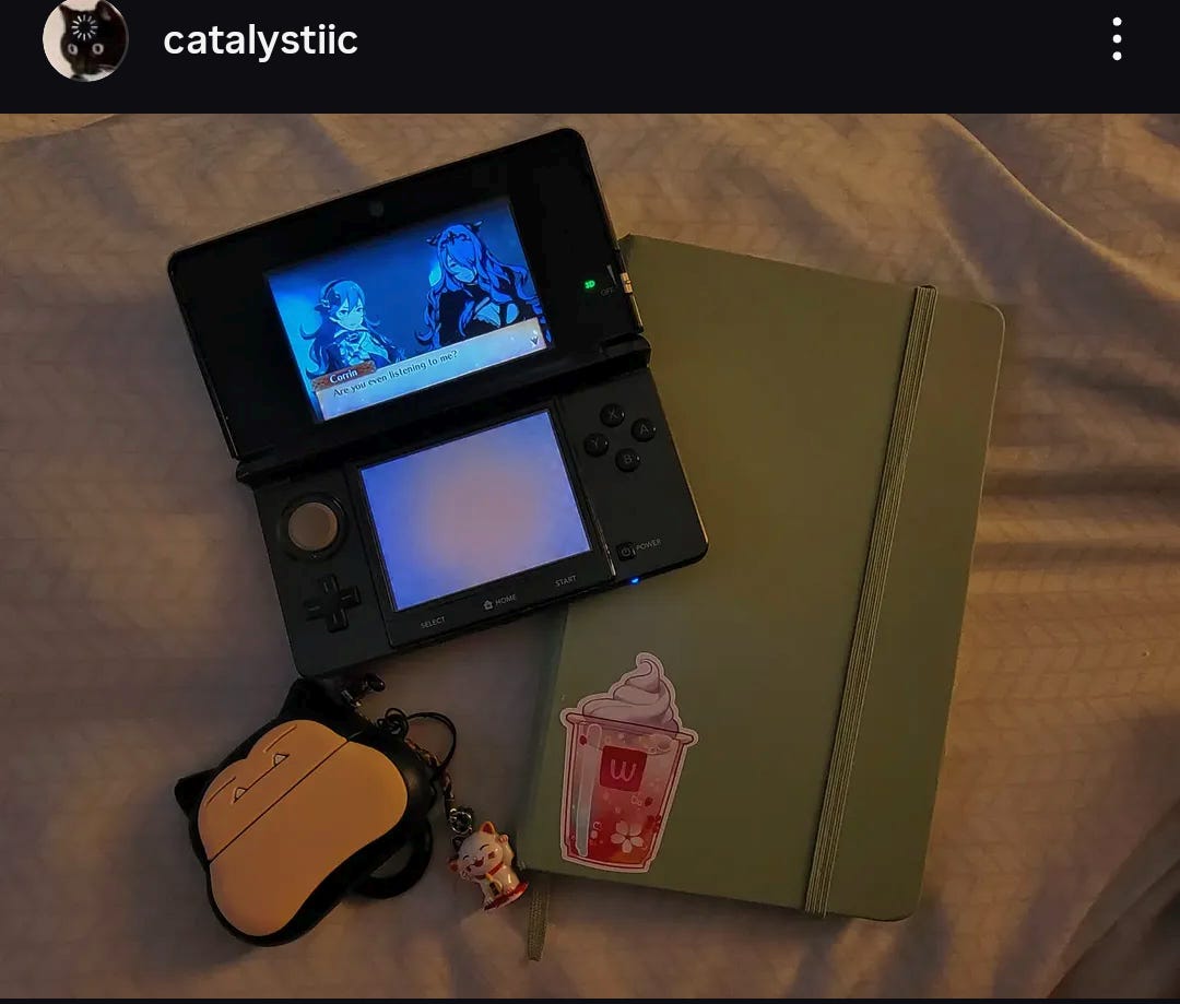 I love this. First, I want to say that I agree with every word you've written here, especially the part about this phenomenon having some roots in misogyny. I don't see much pushback against the RGB controllers and keyboards or the dark aesthetic. But god forbid that a girl wants to put some cute stickers on her 3DS and take a photo of it.